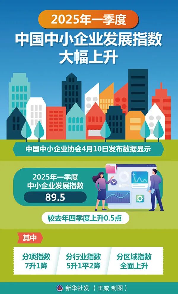 中國中小企業(yè)協(xié)會數(shù)據(jù)顯示,2025年一季度,中小企業(yè)發(fā)展指數(shù)為89.5,較去年四季度上升0.5點。其中,分項指數(shù)7升1降,分行業(yè)指數(shù)5升1平2降,分區(qū)域指數(shù)全面上升。新華社發(fā) 王威 制圖